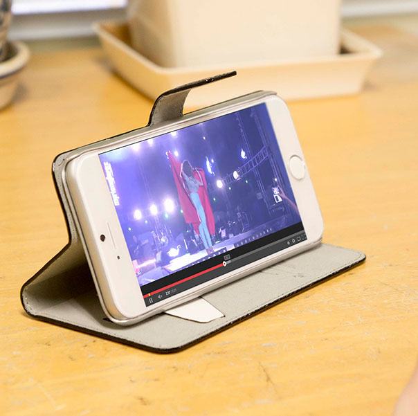 4.7インチになった大迫力画面で動画視聴。そんな使い方にもTS CASEはぴったりです。ケースを図のように折りたたみ、立たせることでスタンドに早変わり。高精細の画面で動画を快適に視聴しょう!。