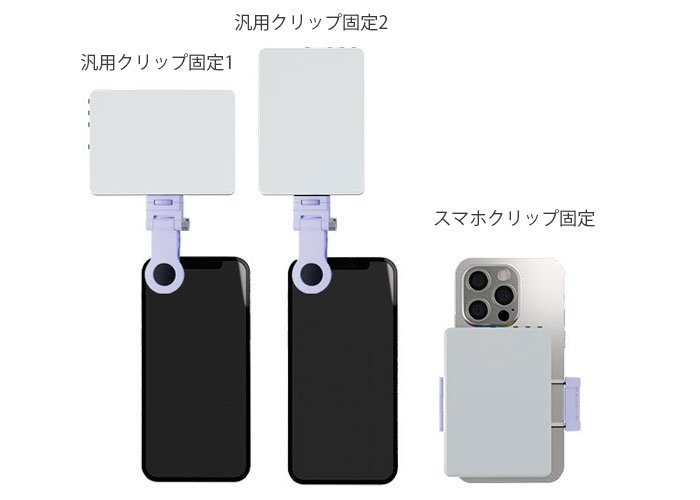 付属のクリップは、強力な保持力と簡単な着脱を両立しました。縦向き、横向き、斜めなど、あらゆる方向に取り付けられます。これまで難しかったアングルからの撮影も思いのままです。スマートフォンだけでなく、タブレットやパソコンなどにも対応。撮影アングルやライティングの方向も自由自在に調整できます。