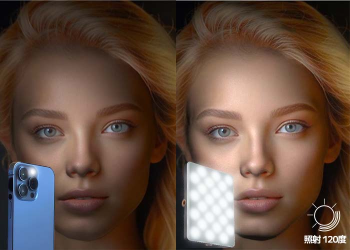 狭い範囲しか照らせない内蔵LEDとは異なり、120度の広範囲をカバー。これにより、被写体全体に柔らかく均質な光が行き渡ります。硬い影を抑え、被写体のディテールを優しく引き立てます。自然光のような美しいライティングは、人物撮影はもちろん、風景や小物撮影にも最適です。より自然で魅力的な映像表現を可能にします。